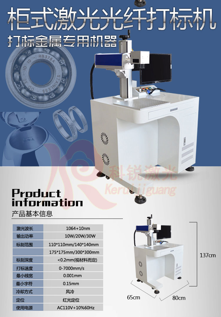 當今國際上最先進激光標記設備,具有光束質量好,體積小、速度快、工作壽命長、安裝靈活方便以及免維護等特點。廣泛用于是集成電路芯片、電腦配件、工業(yè)軸承、鐘表、電子及通訊產品、航天航空器件、各種汽車零件、家電、五金工具、模具、電線電纜、食品包裝、首飾、煙草以及軍用事等眾多領域圖形和文字的標記,以及大批量生產線作業(yè)。光纖激光器,國際最新型,最可靠結構,體積小巧,耗電量小,無高電壓無需龐大的水冷系統(tǒng)(僅需約300W),光束質量高,接近理想光束,USB接口輸出控制,光學掃描振鏡,激光重復頻率高,高速無畸變。